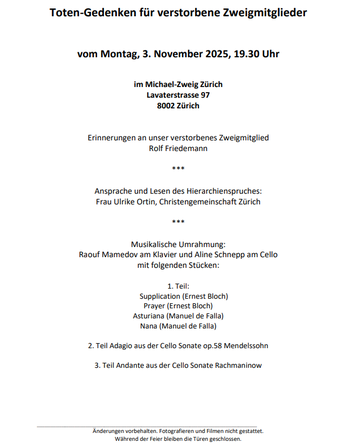 Sekretariat:Susanne Bohlen, info@michaelzweig.ch, 044 202 35 53 (mit Anrufbeantworter)
