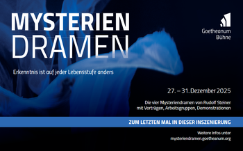 Die Goetheanum-Bühne lädt ein, die Mysteriendramen - als Entwicklungsdrama des modernen Menschen - vom 26.-31. Dezember 2025 zu erleben, ergänzt durch Vorträge, Arbeitsgruppen und Demonstrationen zur künstlerischen Arbeit. Die umrahmende Tagung greift das Thema des «erkennenden Menschen» auf: ERKENNTNIS IST AUF JEDER LEBENSSTUFE ANDERS.