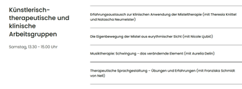 Durch Vorträge und Diskussion im Plenum wird die Thematik von geisteswissenschaftlicher, botanischer und klinischer Warte beleuchtet. In Arbeitsgruppen besteht die Möglichkeit, verschiedene künstlerisch-praktische und klinische Aspekte zu vertiefen.