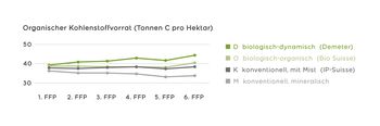 Fertilità del terreno. Come si sviluppa la fertilità del terreno con una coltivazione convenzionale (IP-Suisse), biologica (Bio Suisse) e biodinamica (Demeter)? Con questa domanda iniziò l'esperimento DOK nel 1978. Essa viene gestita da Agroscope e dal FiBL nel sito di Therwil, presso Basel. Dopo 46 anni di ricerca, migliaia di rilevamenti e ricerche scientifiche si delinea un profilo molto chiaro per ognuno dei tre sistemi agricoli. Per quanto riguarda la fertilità del terreno, nel grafico a lato è rappresentata l'evoluzione del tenore di carbonio organico, che è l'indice più importante per la fertilità del terreno. Esso cresce solo con il sistema biodinamico. Non si è ancora riusciti a spiegare perché in termini prettamente chimici, tuttavia il dato di fatto è scientificamente comprovato.